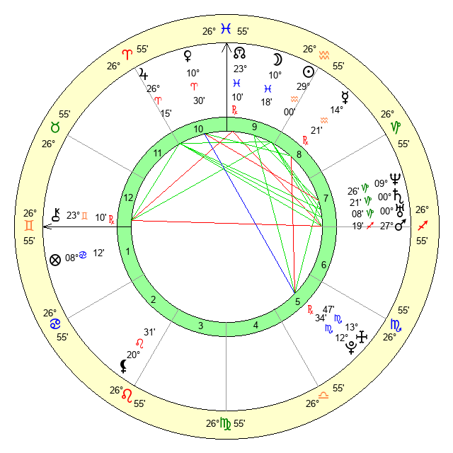| Moon | 7 Pisces 26 | 2 Scorpio 54 | 17 Cancer 53 |