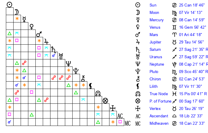 | Moon | 2 Virgo 4 | 14 Aries 58 | 2 Capricorn 38 |