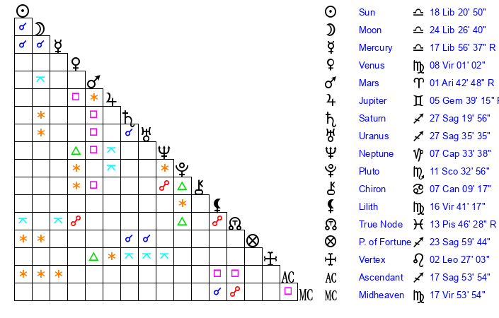 | Moon | 22 Libra 17 | 15 Gemini 19 | 29 Aquarius 59 |