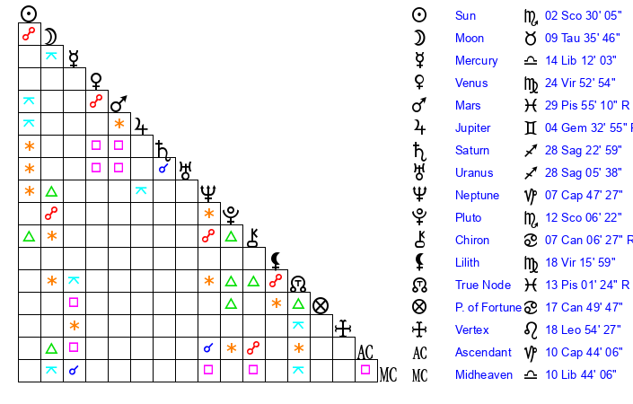 | Moon | 3 Taurus 11 | 13 Sagittarius 0 | 9 Virgo 10 |