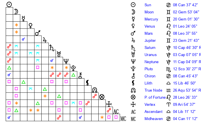 | Jupiter | 23 Gemini 21 | 4 Cancer 39 | 1 Cancer 5 |