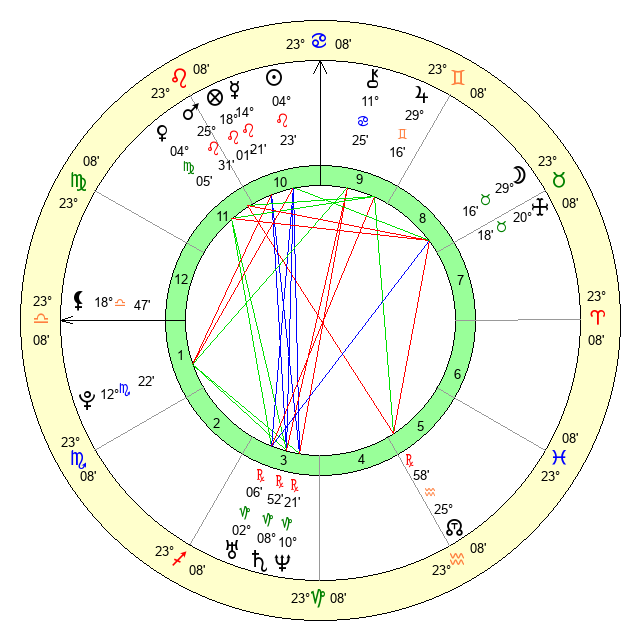 | Moon | 26 Taurus 34 | 5 Virgo 10 | 20 Virgo 15 |
