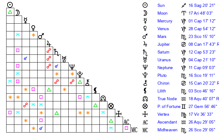 | Pluto | 16 Scorpio 18 | 2 Aquarius 4 | 17 Scorpio 22 |