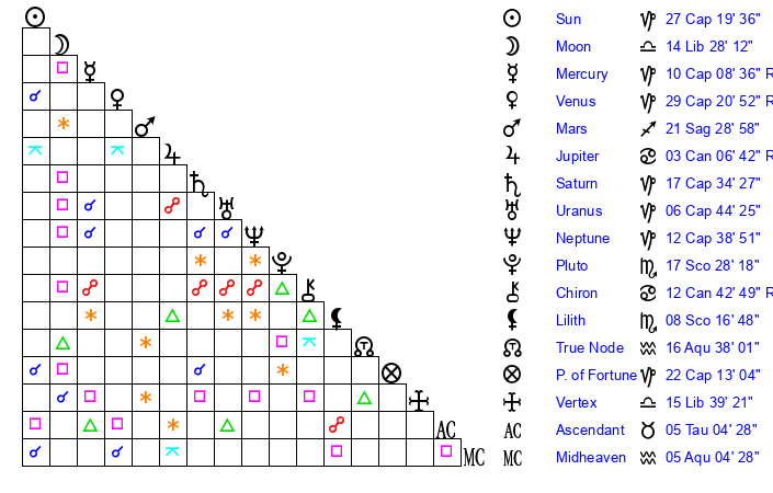 | Moon | 9 Libra 10 | 7 Virgo 6 | 11 Capricorn 24 |