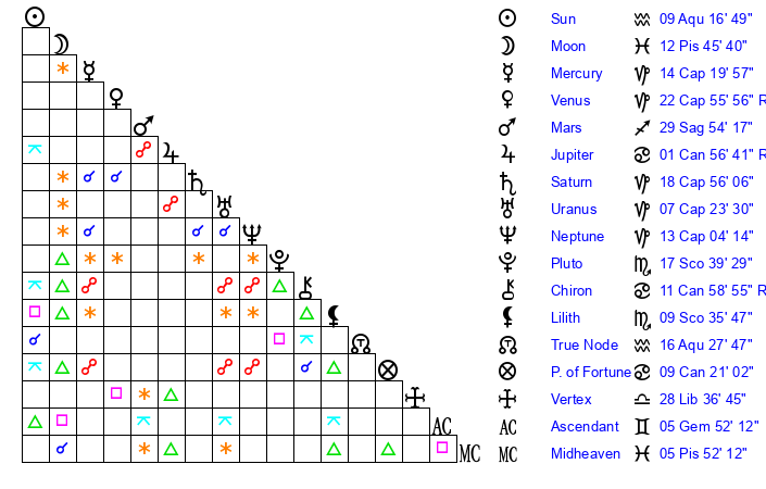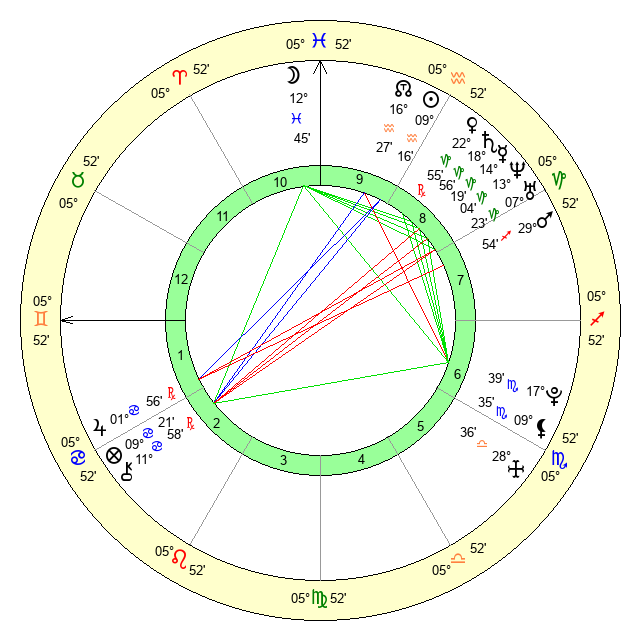 | Moon | 10 Pisces 8 | 6 Aquarius 15 | 29 Gemini 46 |
