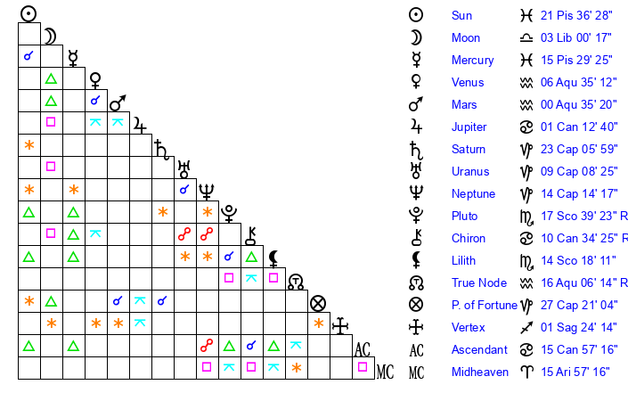 | Pluto | 17 Scorpio 39 | 3 Aquarius 10 | 16 Scorpio 57 |