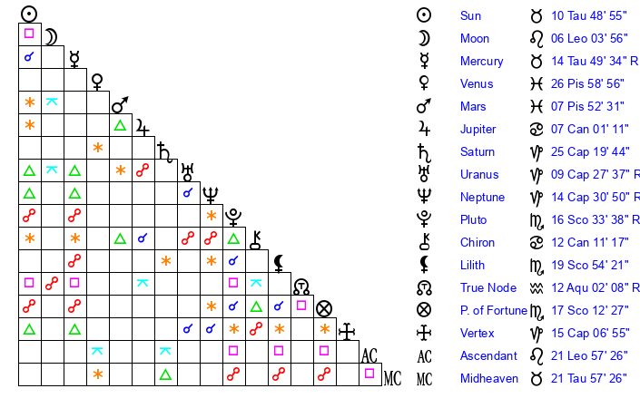 | Mercury | 14 Taurus 55 | 15 Aries 53 | 20 Taurus 36 |