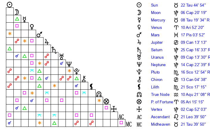 | Sun | 22 Taurus 15 | 22 Taurus 46 | 25 Gemini 49 |