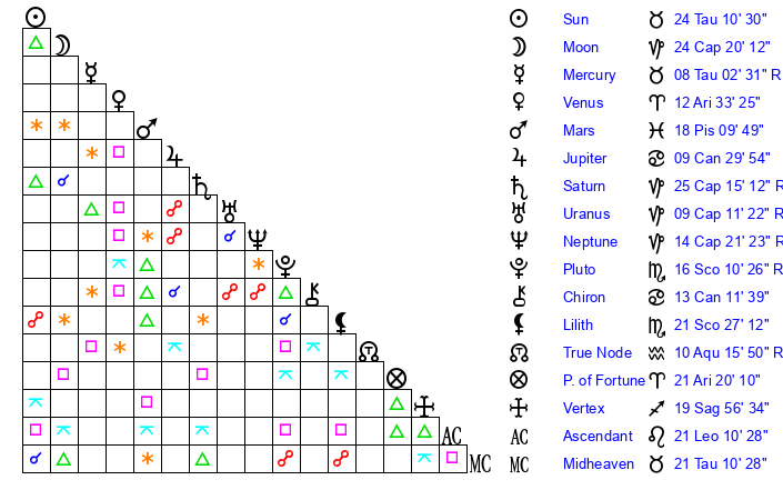 | Moon | 24 Capricorn 15 | 23 Sagittarius 10 | 8 Taurus 23 |