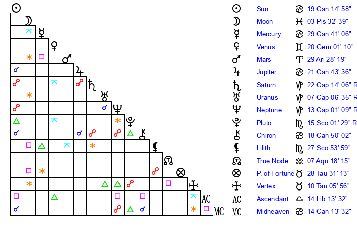 | Moon | 26 Aquarius 16 | 24 Capricorn 14 | 13 Gemini 26 |