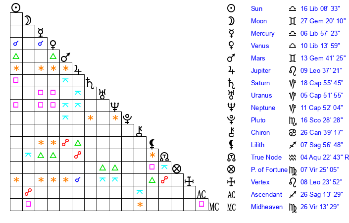| Pluto | 16 Scorpio 27 | 1 Aquarius 21 | 17 Scorpio 49 |