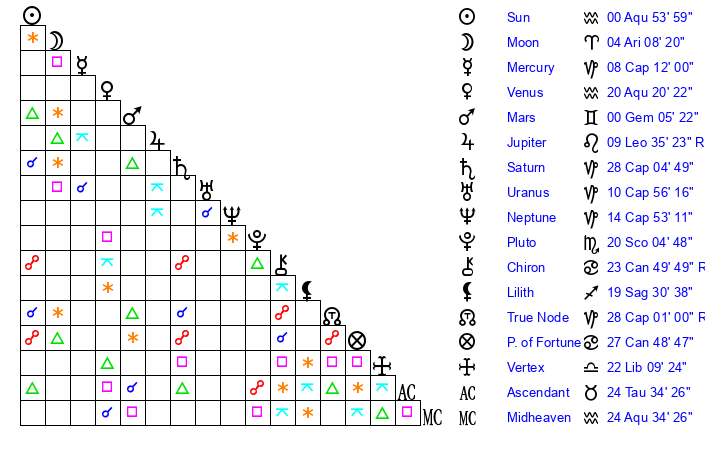 | Saturn | 28 Capricorn 5 | 16 Pisces 14 | 1 Aquarius 57 |