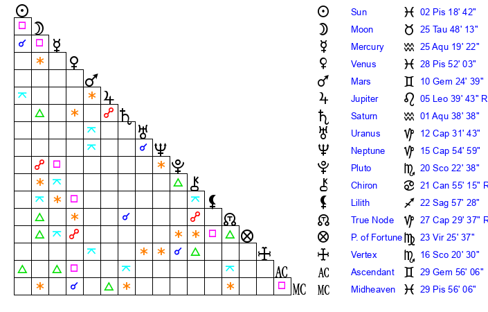 | Saturn | 1 Aquarius 38 | 19 Pisces 41 | 4 Aquarius 48 |