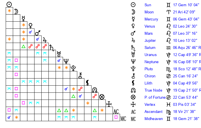 | Moon | 18 Aries 56 | 13 Scorpio 50 | 26 Cancer 9 |