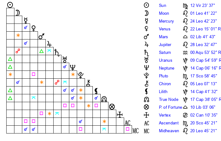 | Venus | 22 Leo 18 | 12 Leo 42 | 1 Virgo 40 |