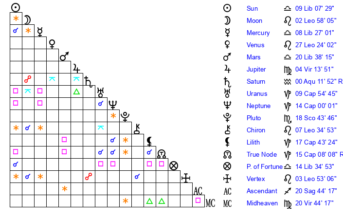 | Sun | 8 Libra 34 | 9 Libra 19 | 12 Scorpio 20 |
