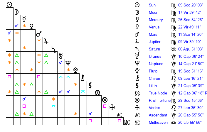 | Pluto | 19 Scorpio 51 | 1 Aquarius 27 | 21 Scorpio 12 |