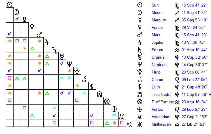 | Moon | 6 Sagittarius 16 | 24 Gemini 28 | 26 Aquarius 5 |