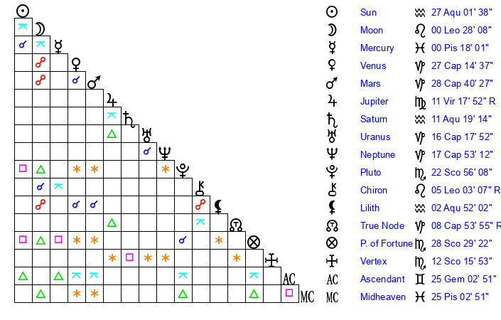 | Saturn | 11 Aquarius 17 | 19 Pisces 5 | 14 Aquarius 50 |
