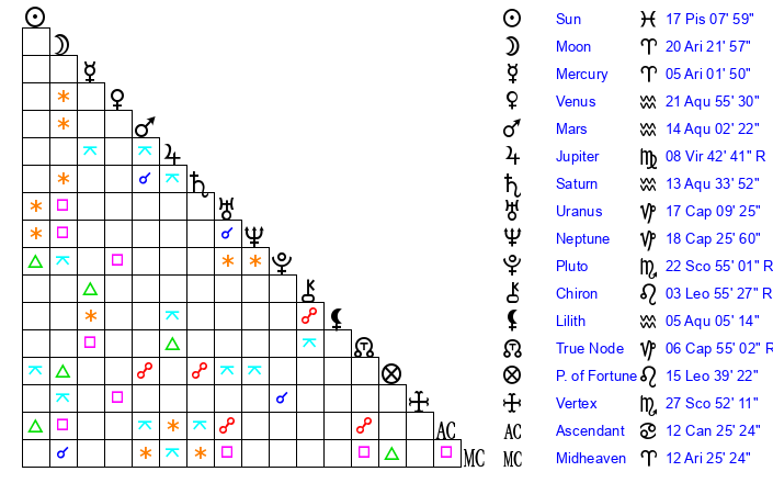 | Venus | 21 Aquarius 41 | 10 Aries 16 | 2 Aries 25 |