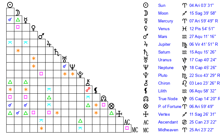 | Sun | 3 Aries 52 | 3 Aries 52 | 6 Taurus 16 |