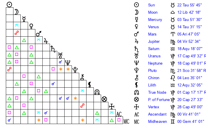 | Sun | 22 Taurus 44 | 22 Taurus 46 | 24 Gemini 24 |