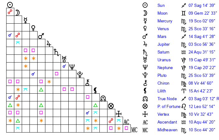| Pluto | 25 Scorpio 53 | 1 Aquarius 51 | 27 Scorpio 2 |