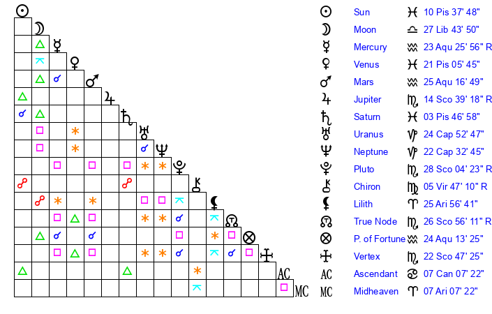 | Moon | 24 Libra 47 | 27 Pisces 51 | 17 Sagittarius 42 |