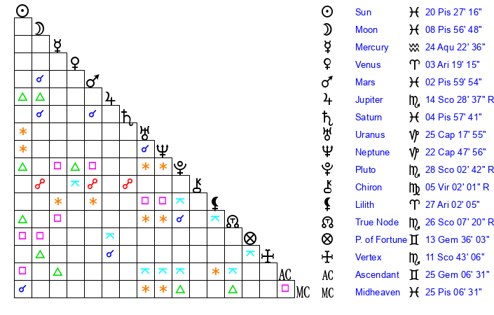 | Mars | 3 Pisces 0 | 18 Cancer 21 | 27 Pisces 18 |