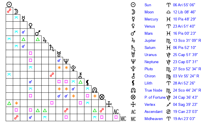 | Moon | 3 Libra 34 | 6 Pisces 36 | 27 Scorpio 16 |