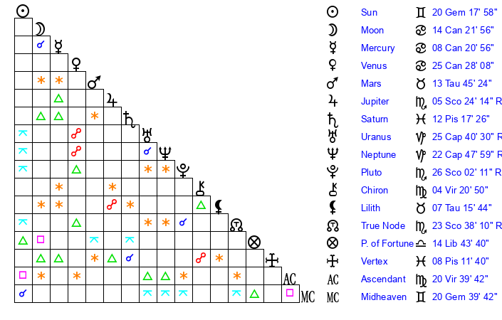 | Sun | 20 Gemini 7 | 20 Gemini 36 | 19 Cancer 41 |