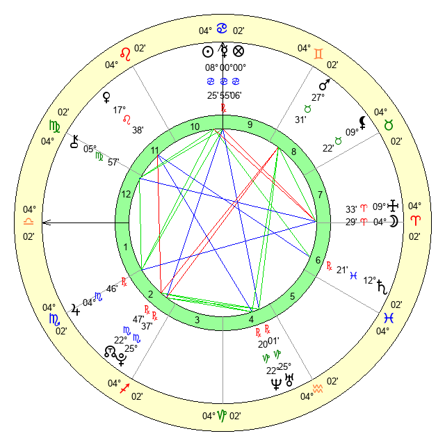 | Moon | 2 Aries 19 | 10 Virgo 6 | 15 Taurus 53 |