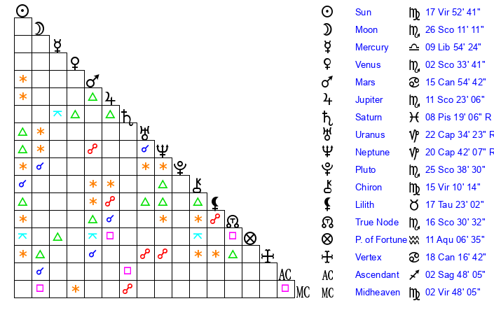 | Moon | 18 Scorpio 0 | 21 Aries 36 | 10 Capricorn 52 |
