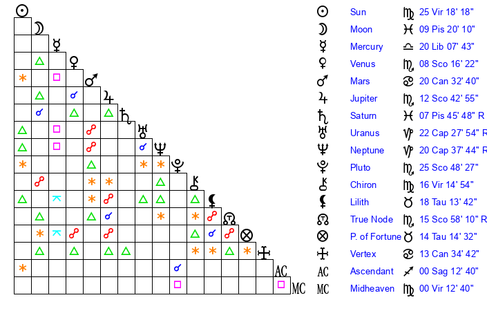 | Sun | 25 Virgo 7 | 25 Virgo 36 | 25 Libra 38 |