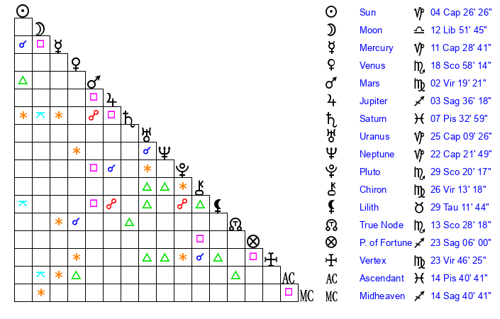 | Moon | 10 Libra 18 | 15 Pisces 53 | 3 Sagittarius 4 |