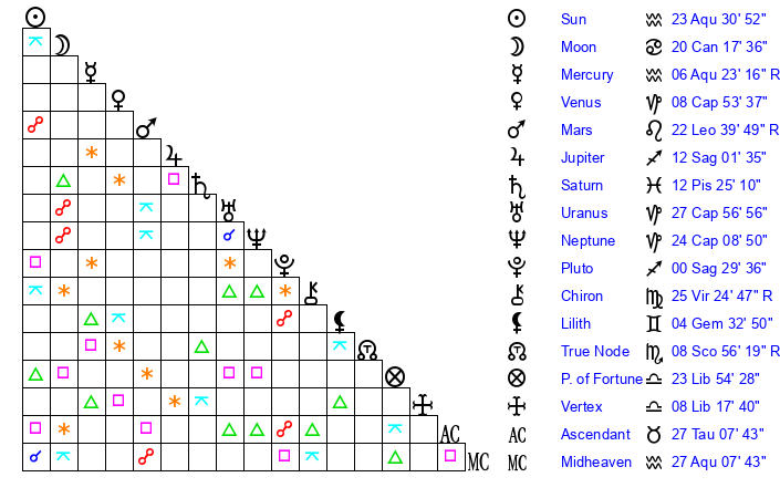 | Pluto | 0 Sagittarius 28 | 2 Aquarius 24 | 0 Sagittarius 33 |