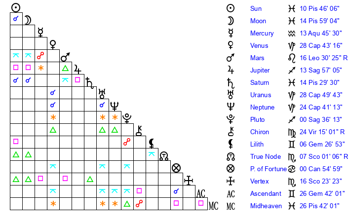 | Mercury | 13 Aquarius 11 | 26 Pisces 44 | 26 Pisces 18 |