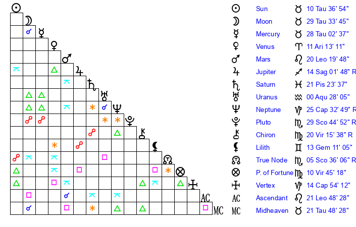 | Venus | 10 Aries 59 | 0 Aries 19 | 17 Taurus 21 |
