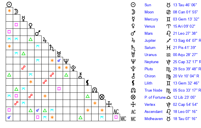 | Sun | 13 Taurus 20 | 14 Taurus 3 | 12 Gemini 14 |