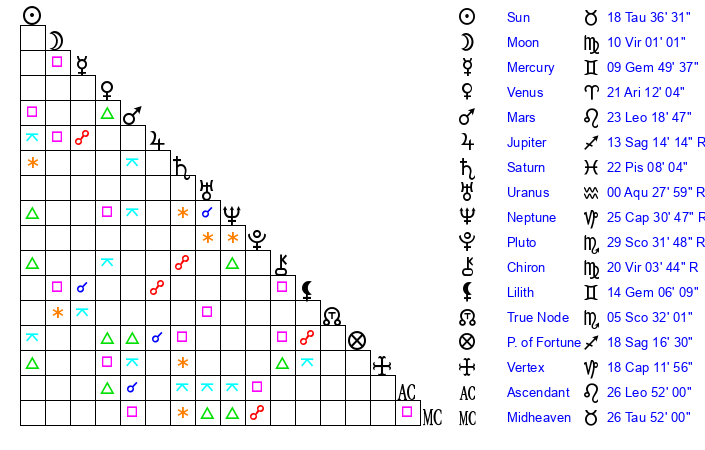 | Sun | 18 Taurus 11 | 18 Taurus 54 | 17 Gemini 1 |