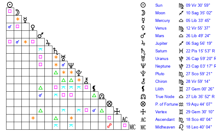 | Sun | 9 Virgo 20 | 10 Virgo 3 | 8 Libra 36 |