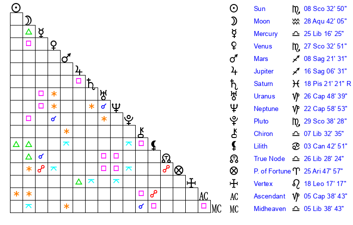 | Sun | 8 Scorpio 21 | 9 Scorpio 5 | 8 Sagittarius 35 |