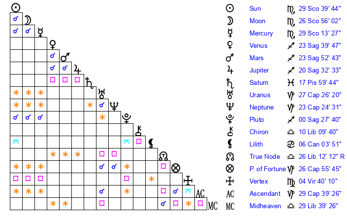 | Venus | 23 Sagittarius 26 | 19 Scorpio 14 | 0 Aquarius 37 |