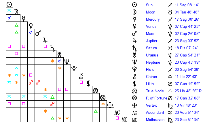 | Moon | 28 Aries 18 | 17 Taurus 13 | 1 Gemini 57 |