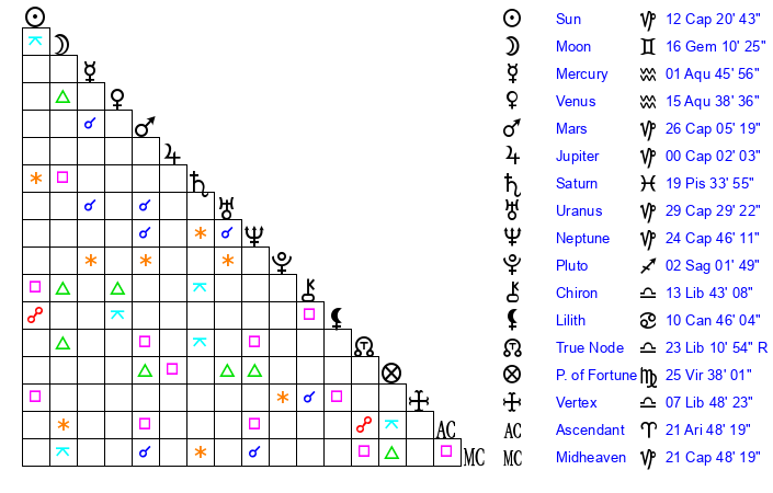 | Jupiter | 29 Sagittarius 56 | 12 Gemini 58 | 6 Capricorn 16 |