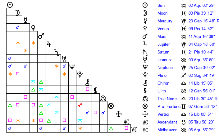 | Moon | 25 Aquarius 54 | 6 Scorpio 51 | 18 Pisces 27 |