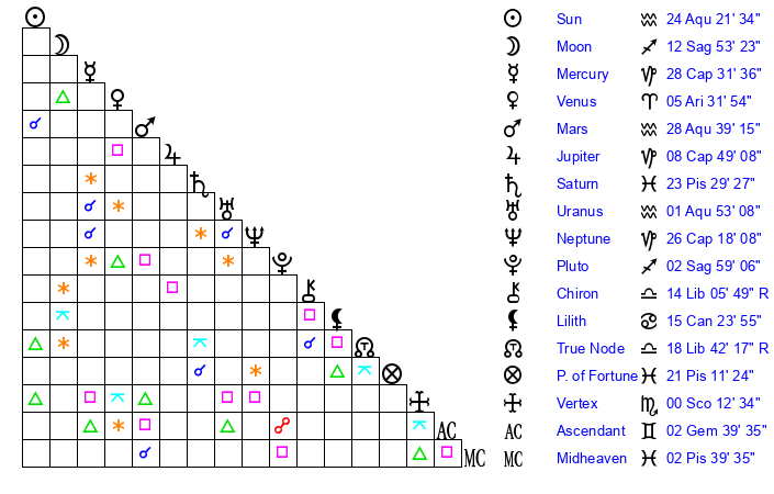 | Sun | 23 Aquarius 50 | 24 Aquarius 48 | 22 Pisces 58 |