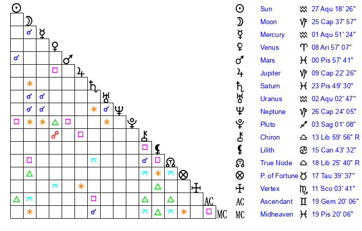 | Sun | 26 Aquarius 52 | 27 Aquarius 50 | 25 Pisces 57 |