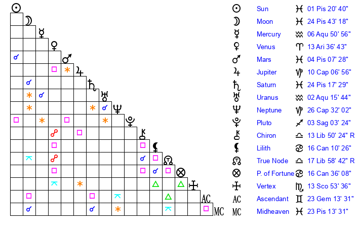| Sun | 0 Pisces 54 | 1 Pisces 52 | 29 Pisces 56 |