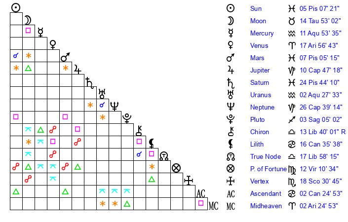 | Mars | 6 Pisces 56 | 17 Cancer 1 | 29 Pisces 43 |